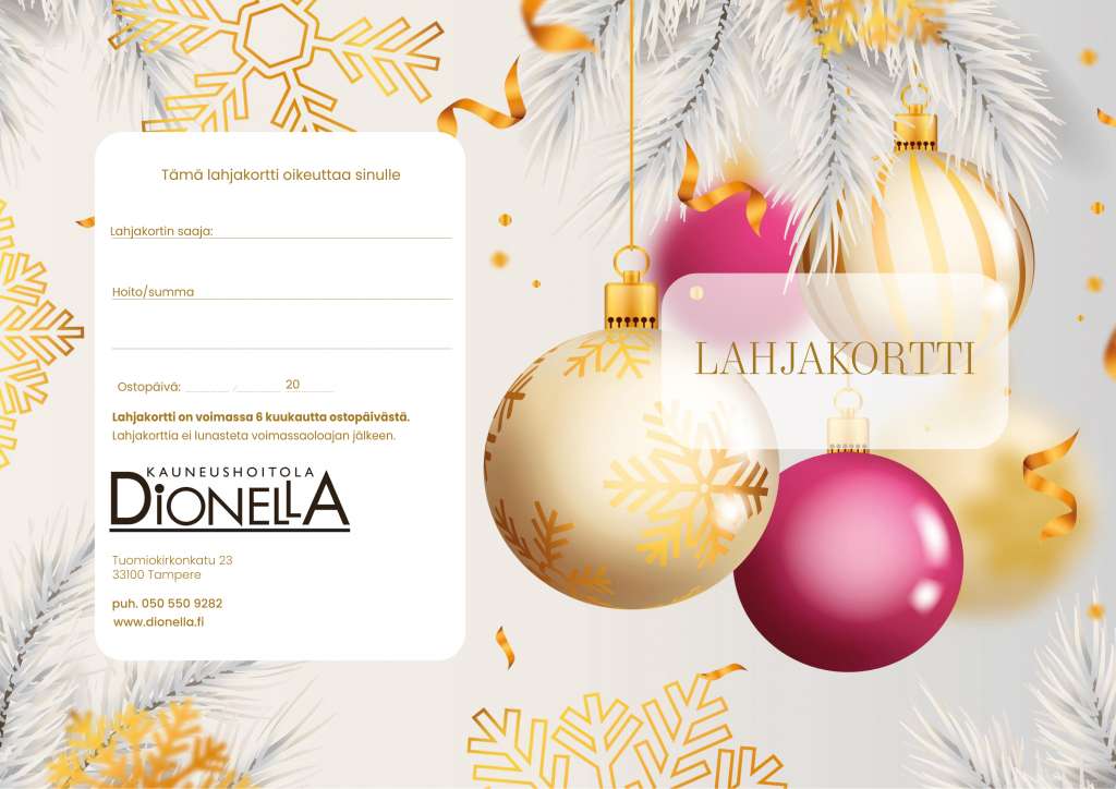 - täytä lahjakorttiin tulostuksen jälkeen: lahjan saajan nimi, hoidon/hoitojen nimi tai euromäärä lahjalle, ostopäivämäärä