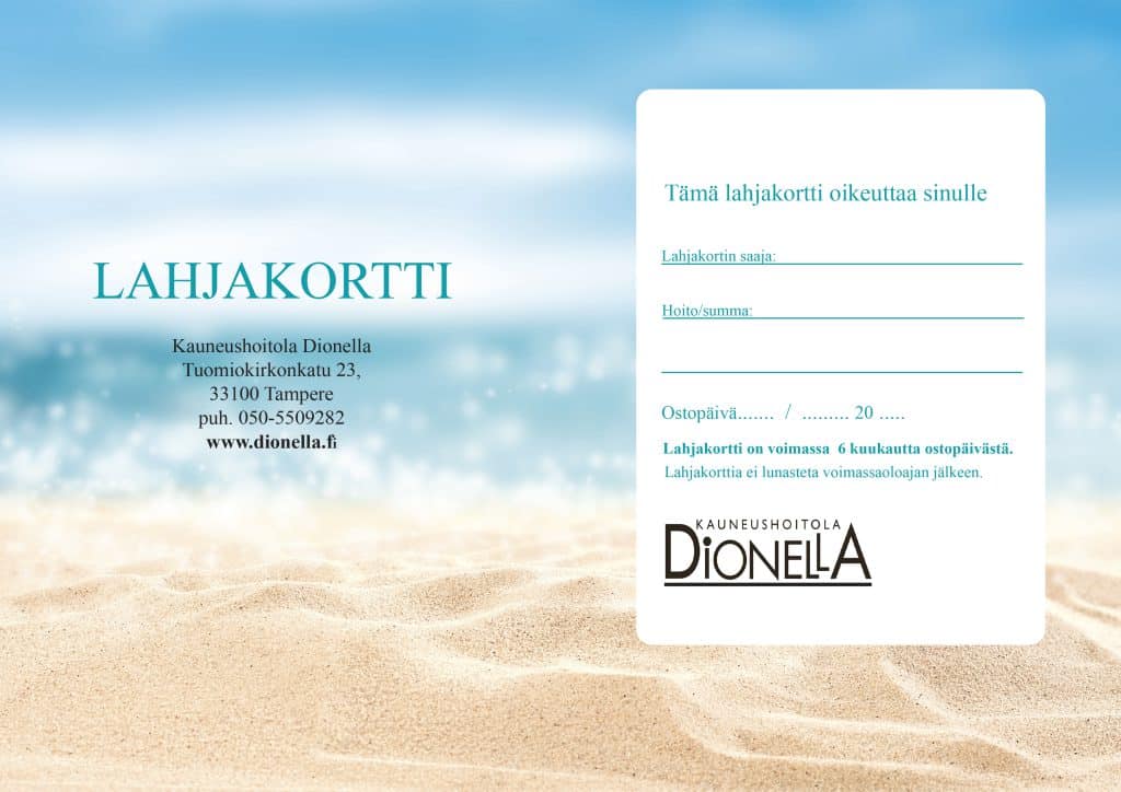 Voit valita lahjakorttiin haluamasi hoidon/hoidot hinnastosta, tai valita suosituimmat lahjakortit-listalta mieleisesi, tai valita euromääräisen summan, jonka voi käyttää hoitoon/hoitoihin tai tuoteostoihin, (yhdellä tai useammalla kertaa).